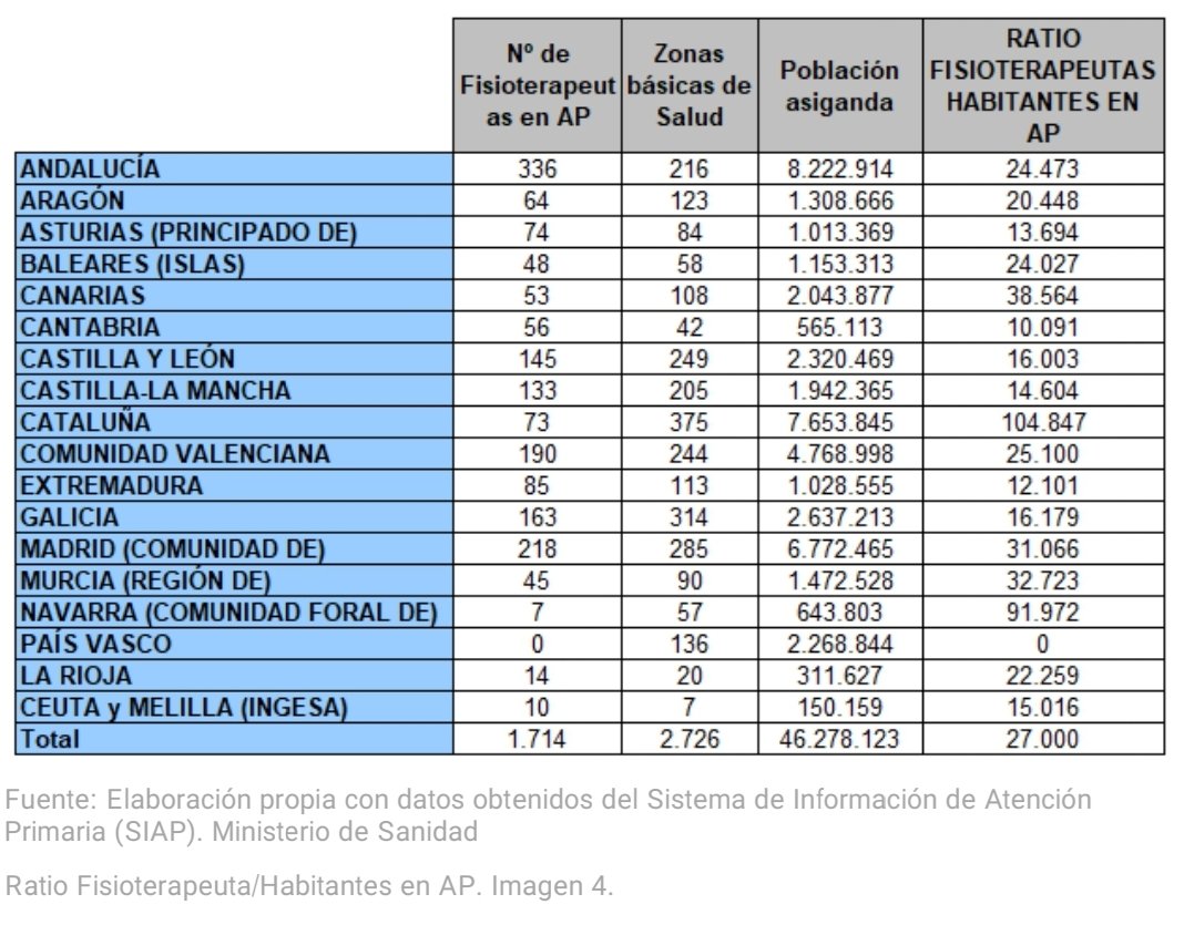 Ratio de Fisioterapeutas en Atención Primaria por habitante según datos del Sistema de Información de Atención Primaria del Ministerio de Sanidad de 2019. World Physiotherapy estima que el ratio adecuado es de 1 fisioterapeuta por cada 1400 habitantes. Tabla realizada por Carmen Secades, fisioterapeuta de Atención Primaria del Servicio Cántabro de Salud.
